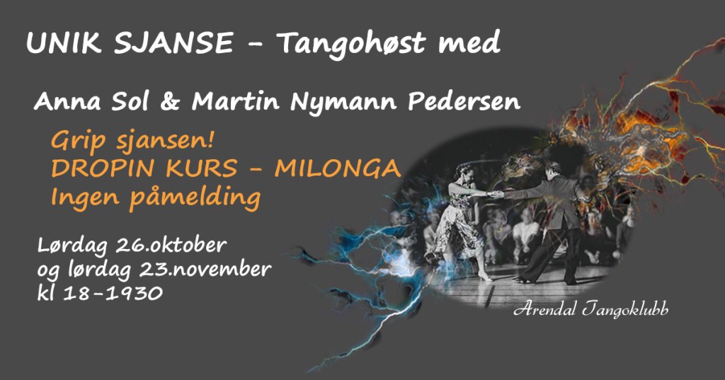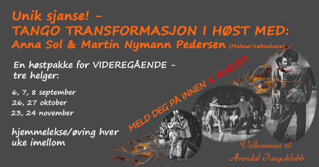 På grunn av sommer og ferie er fristen for påmelding til en unik tangohøst med kurs for begynnere og videregående med Anna Sol og Martin Nymann Pedersen forlenget. MELD DEG PÅ INNEN 5.AUGUST!!